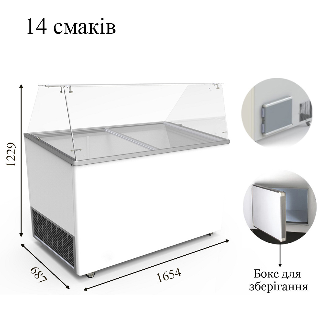 | Місця для гастрономічних ємностей: | Пластикові гастроємкості 360х155 мм, на 14 смаків |